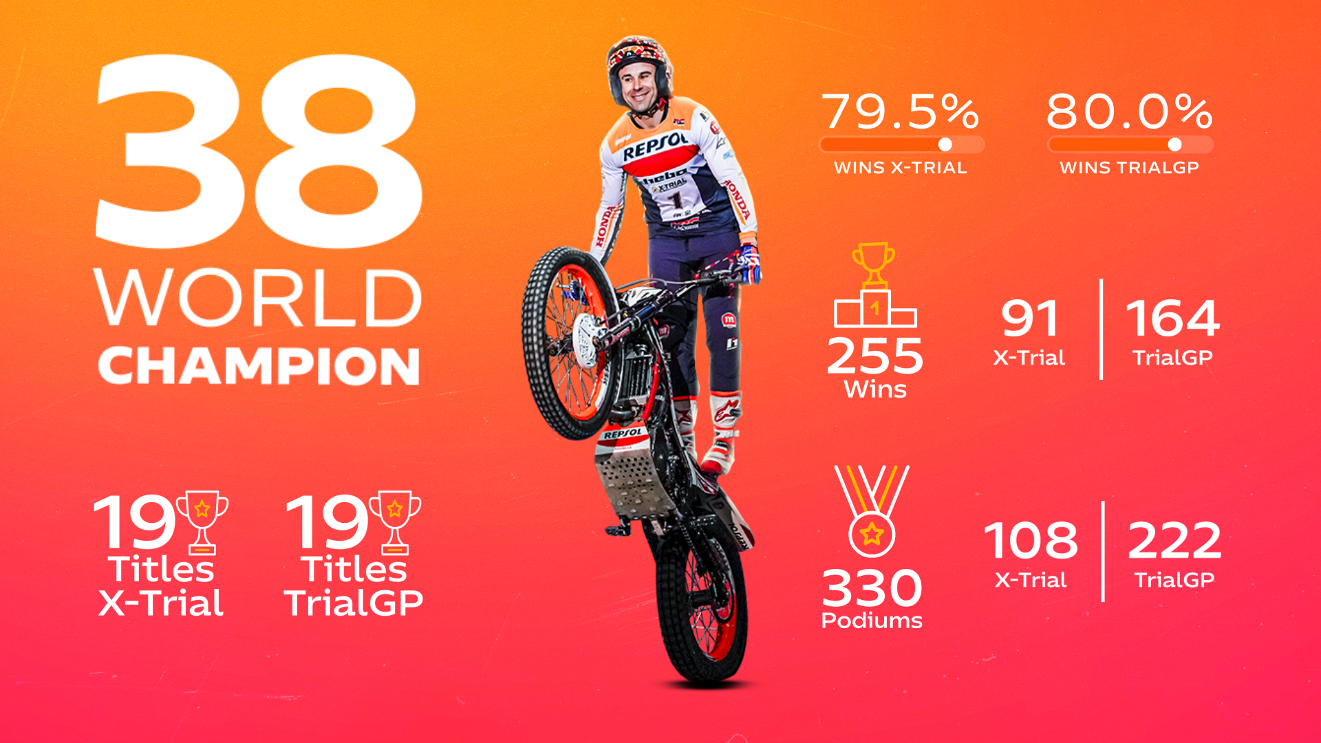 Toni Bou has become, through his talent, effort, and passion, a one of the most successful and consistent athletes in Spain and the world. With his 38th World Championship -his 19th in TrialGP, he has extended a streak that began in 2007, when he signed for Honda and began representing Repsol.